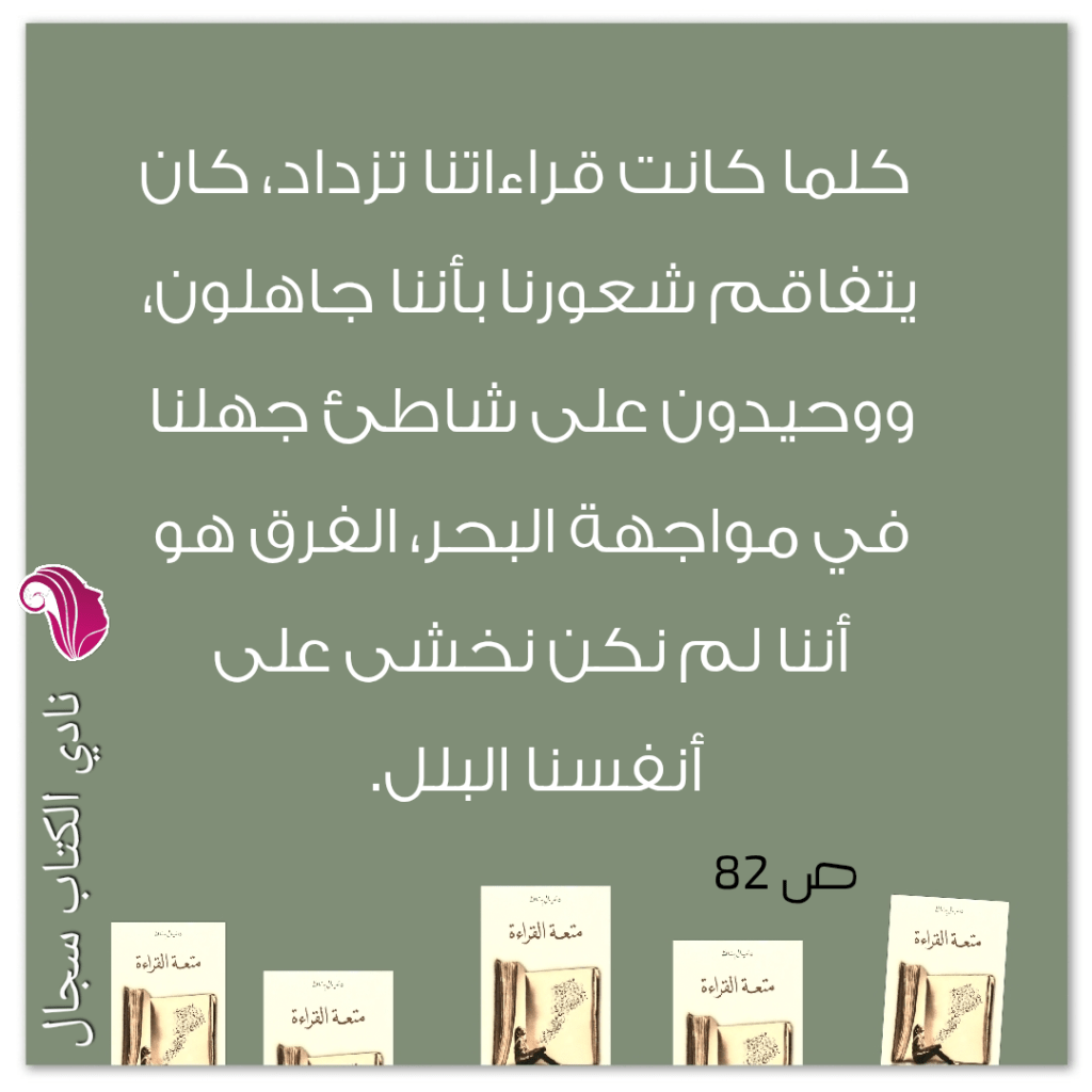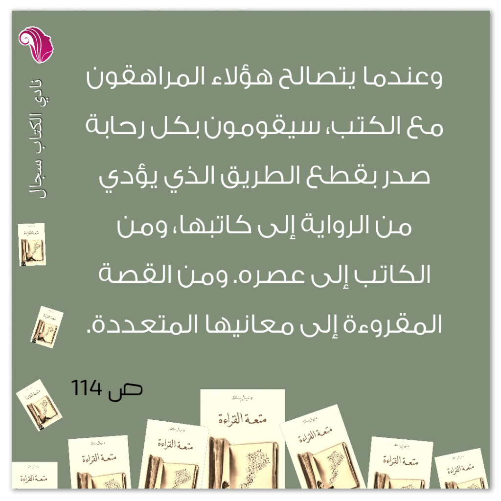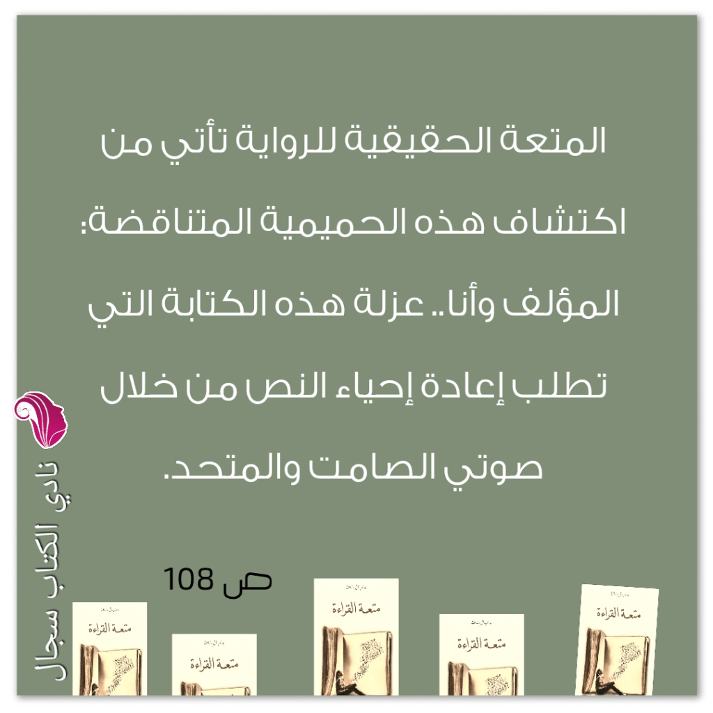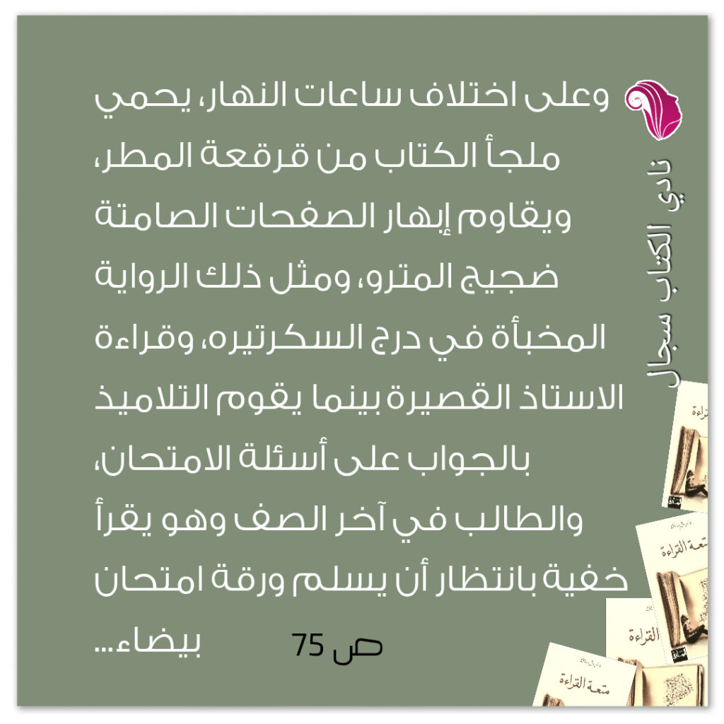 ونصبح في أمان نحن معشر القراء من كل العالم حولنا .. فنحن لسنا هنا.. نحن هناك.. نتجول بين الصفحات .. نعيش في تلك البيوت.. نطرق تلك الدروب.. وننصت إلى كل تلك الحوارات حتى التي بين الشخصية وقلبها.. ونمد ايدينا نطبطب على ظهر ما.. ونمسك بيد ما.. ونقهقه حتى تدمع اعيننا .. ونتبسم ونومئ .. وتفتح ملامحنا دهشة او تصعد انفاسنا فقرة .. و.. و.. أجل هذا نحن معشر القراء.