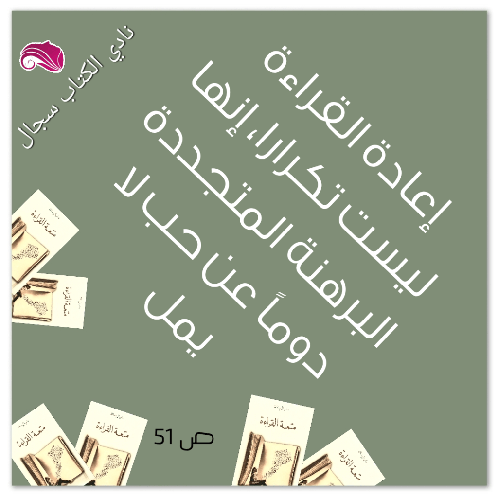 فالقراءة حب.. يخالط عبيره كل خلية في القارئ.. والحب إن لم يغذى ذبل.. و غذاء كهذا لا يفهم معنى الوقت.. ولا ينتابه جوع.. لذى قد يذبل إن اطرناه بإطار وقت.. طقوس .. شروط.. الخ.. فاقرأ كلما دق قلبك..