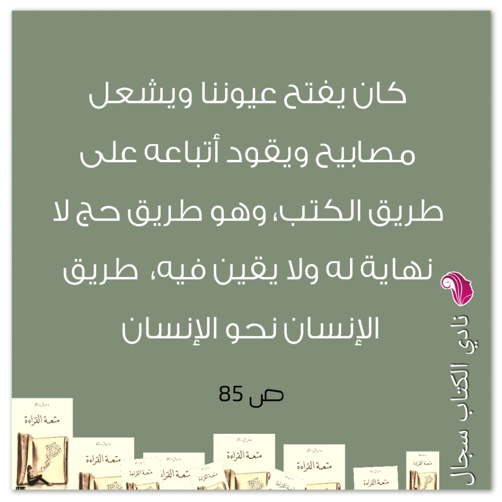 أجل من ذا الذي منا لا يطمح حد الطمع في أن يعاود التلاقي بحبيب مؤنس معلم صبور حبيب الملمس زكي الرائحة.. نعم إنه الكتاب.. ذاك الكتاب الذي تشعر وانت تقرأه بأنه كتب من أجلك.. لك وحدك.. مهما تناوشته أيادٍ أو مسحته أعين..