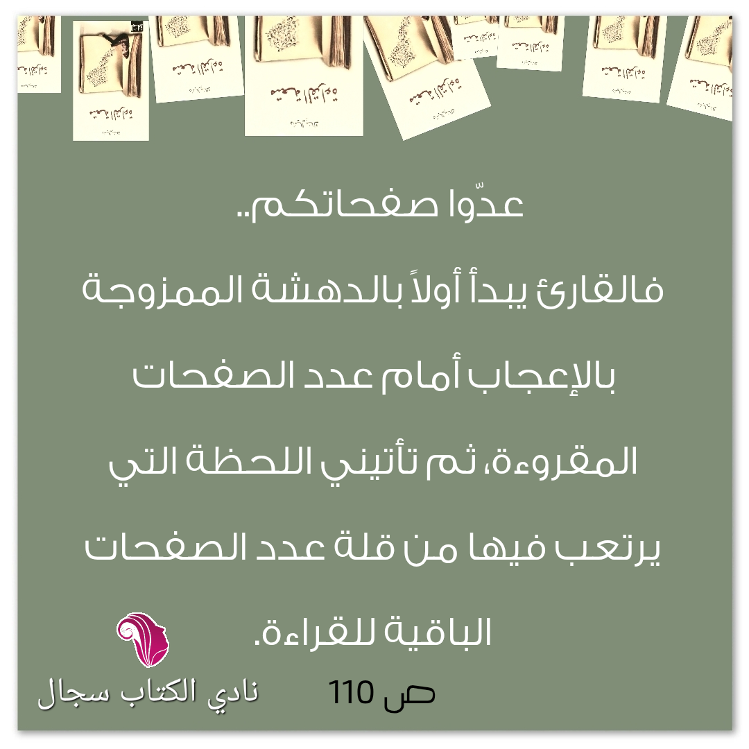 ونصبح في أمان نحن معشر القراء من كل العالم حولنا .. فنحن لسنا هنا.. نحن هناك.. نتجول بين الصفحات .. نعيش في تلك البيوت.. نطرق تلك الدروب.. وننصت إلى كل تلك الحوارات حتى التي بين الشخصية وقلبها.. ونمد ايدينا نطبطب على ظهر ما.. ونمسك بيد ما.. ونقهقه حتى تدمع اعيننا .. ونتبسم ونومئ .. وتفتح ملامحنا دهشة او تصعد انفاسنا فقرة .. و.. و.. أجل هذا نحن معشر القراء.