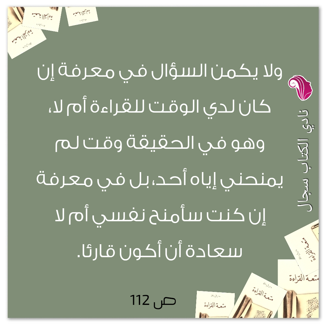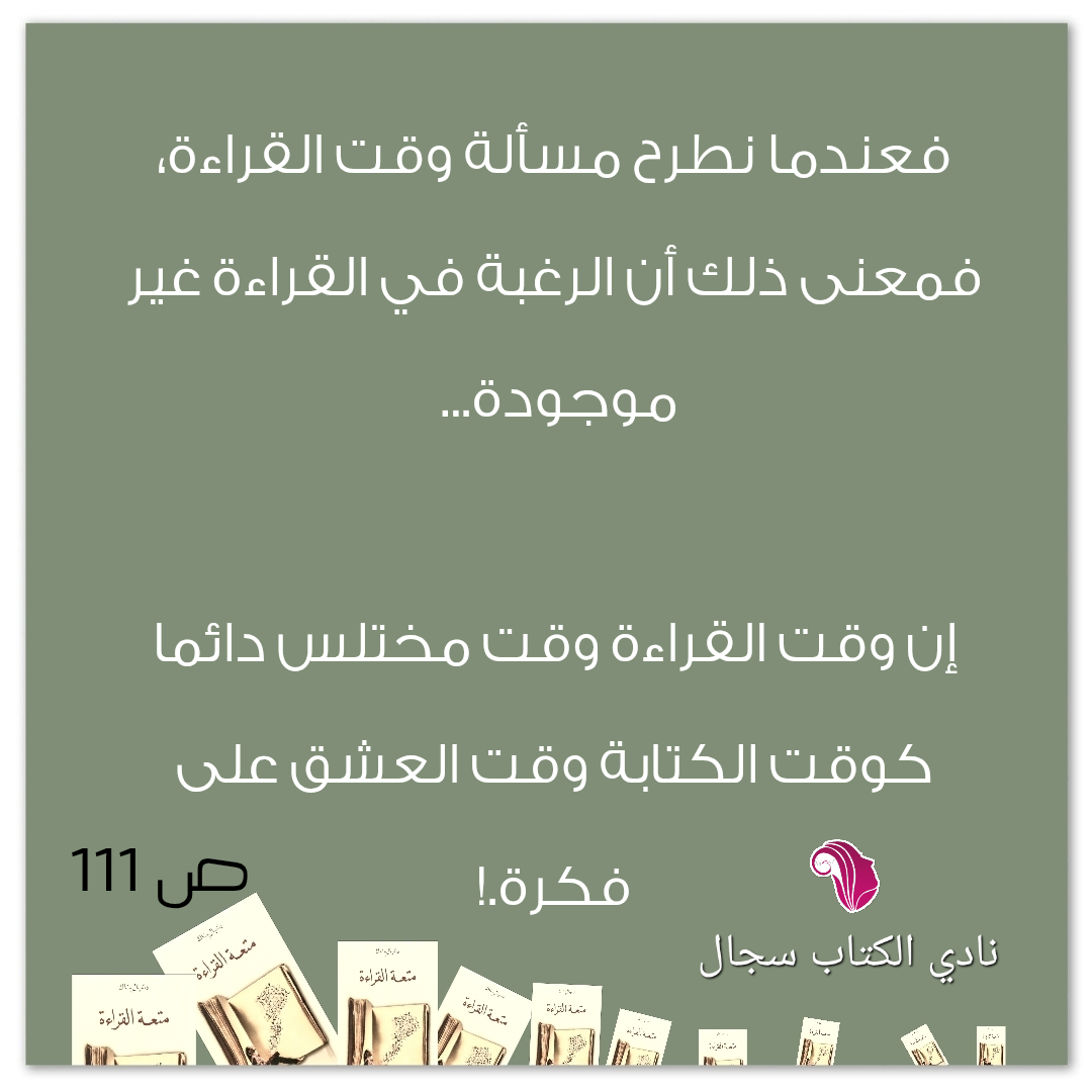 فالقراءة حب.. يخالط عبيره كل خلية في القارئ.. والحب إن لم يغذى ذبل.. و غذاء كهذا لا يفهم معنى الوقت.. ولا ينتابه جوع.. لذى قد يذبل إن اطرناه بإطار وقت.. طقوس .. شروط.. الخ.. فاقرأ كلما دق قلبك..